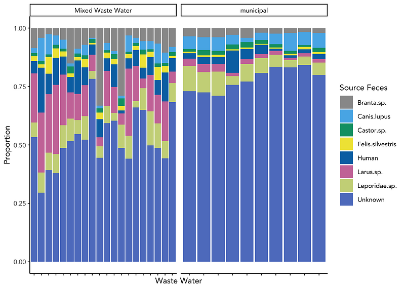 Raw sewage samples are often used as stand-ins for human stool signal in environmental source tracking studies. I'm using SourceTracker to determine the relative contribution of human and other animal feces to the signal. This project involves bringing together many disparate HTS datasets of fecal samples from different animal sources and with different hypervariable regions of 16S. I'm developing a compositional model validation in R to accompany this analysis.